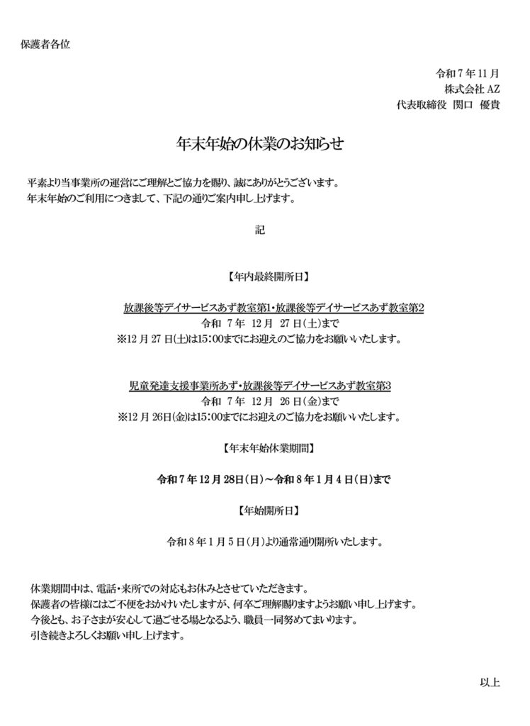 平素より放課後等デイサービスあず教室第1・第2の運営にご理解とご協力をしてくださり、ありがとうございます。