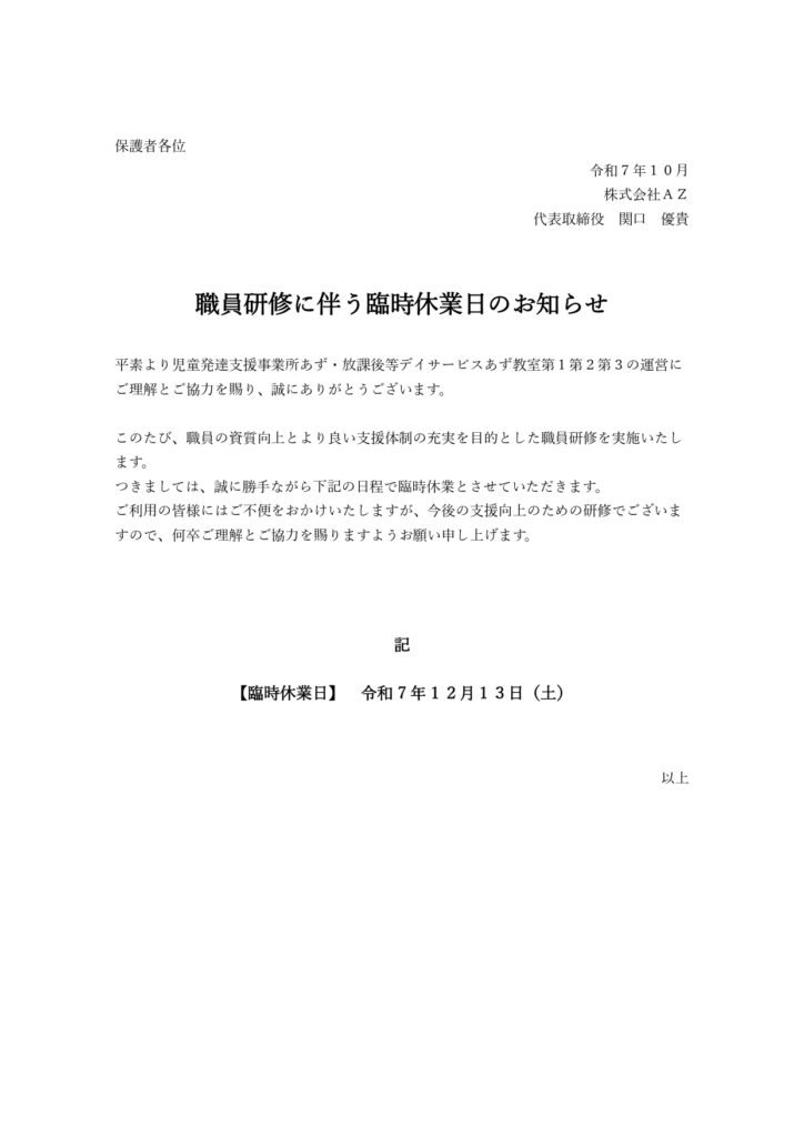 社員研修に伴う臨時休業のお知らせ
